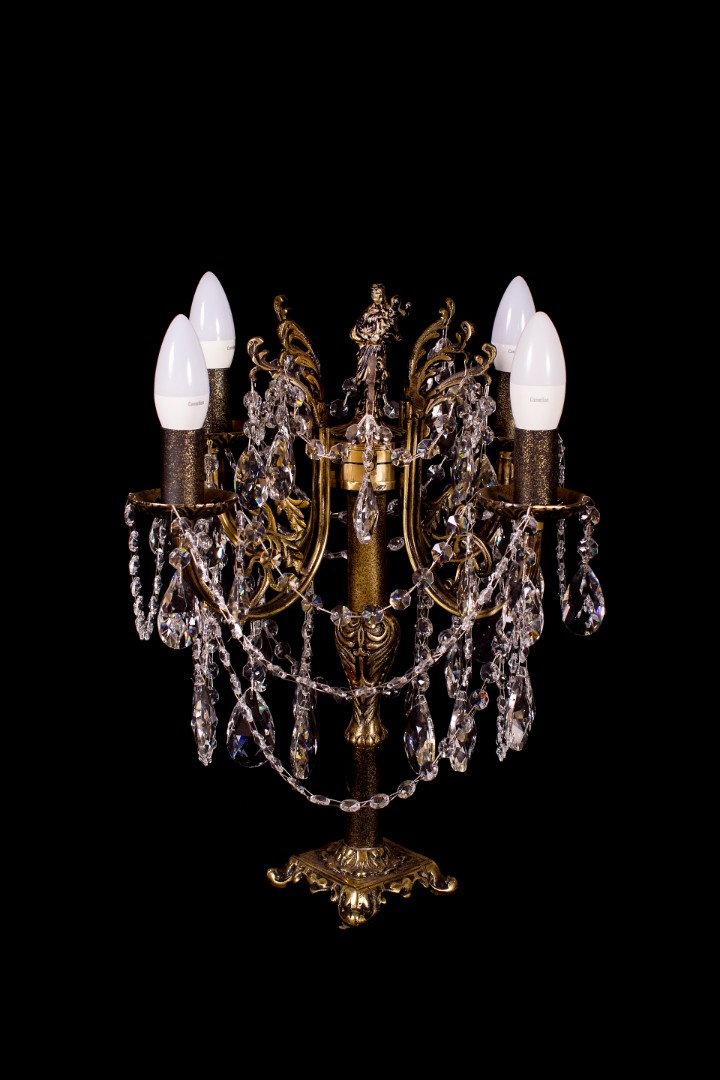 Бронзовая античная настольная лампа . Имеет 4 лампы , цоколь Е-14, лучше применять лампы светодиодные в виде свечей 8-12 вт.