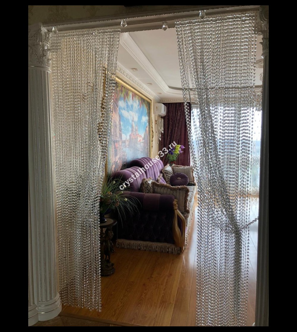 Штора из хрустальных прозрачных подвесок "октагон". Возможно исполнение с подсветкой светодиодной лентой, расположенной внутри каркаса.. Цена за 1 кв. м. Крепление планки возможно к потолку или к стене (по желанию заказчика). Цвет фурнитуры золото или серебро.