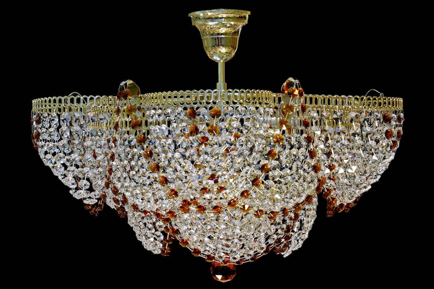 Подвесная люстра в с хрустальными вставками чайного цвета. Возможен цвет хрусталиков: зелёный, красный, чёрный, синий, розовый.