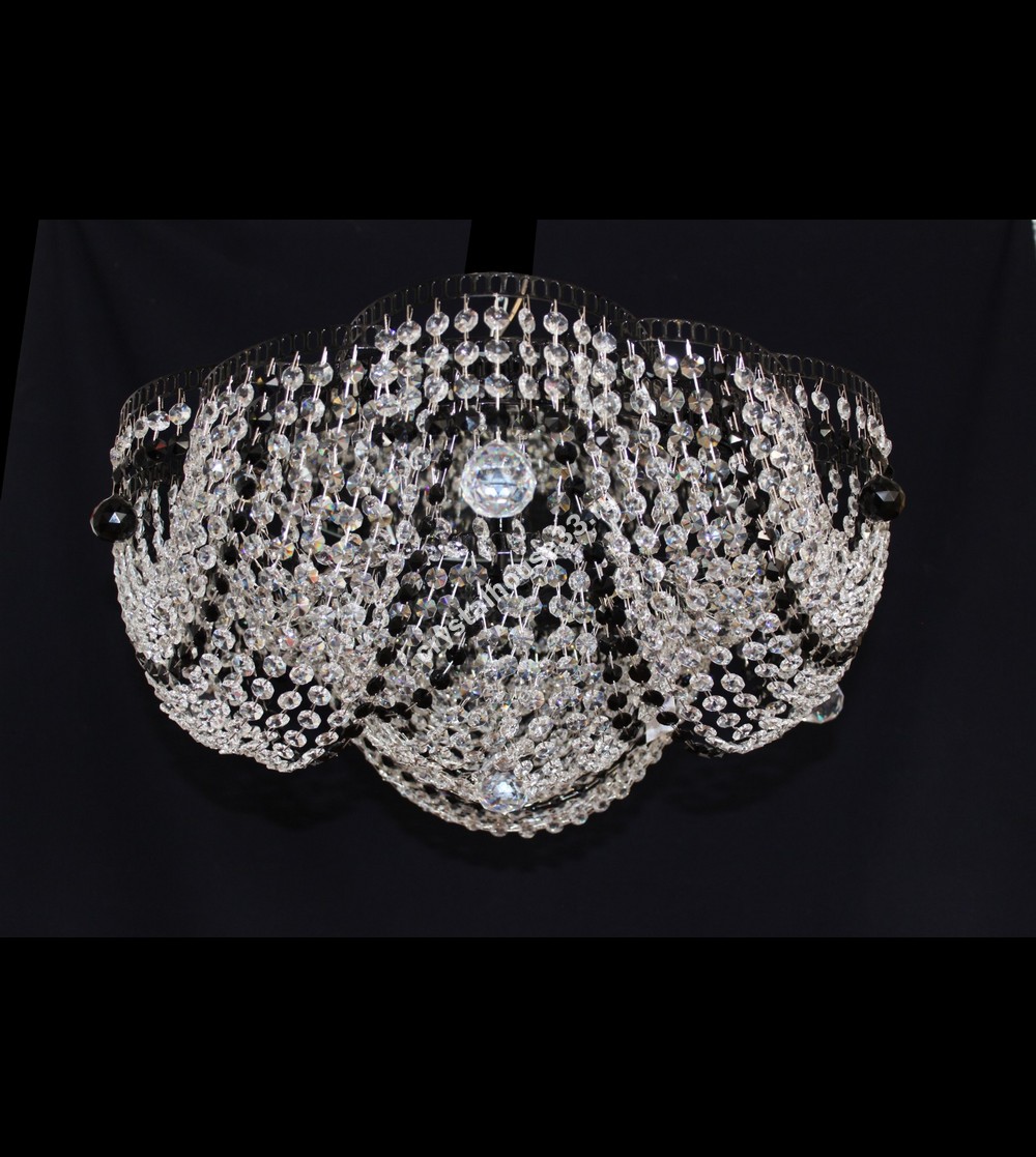 Потолочная люстра с чёрным каркасом, с цветными подвесками. Можно компоновать подвесками цветов: красный, синий, зелёный, коричневый, жёлтый, фиолетовый, розовый, чёрный, дымчатый, янтарный. Крепление на крюк. С зеркалом. Цоколь Е- 27